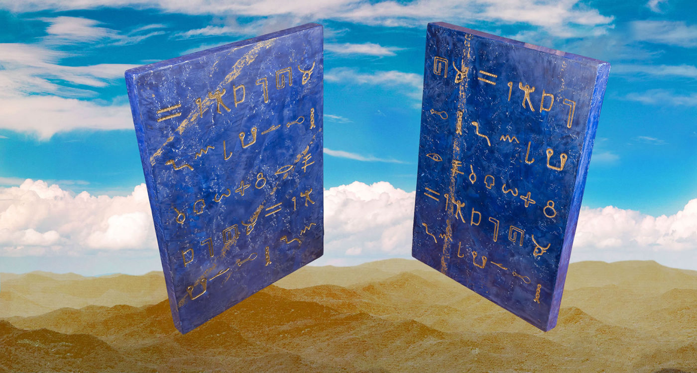 It was not an easy read. Here’s what I think it says. When the Hebrews first went into Egypt during a seven year famine, they were welcomed by Joseph, a fellow Hebrew who was by then the Prime Minister of Egypt. The Hebrews were invited to stay and got into to the semi-precious stone business. They left Egyptian style hieroglyphic writing on rock faces in the place where they were mining turquoise. Because of the unusual arrangement and references to specific Hebrews in the glyphs, Dr. Petrovich and other scholars concluded that these glyphs were the work of ancient Hebrews and in fact the world’s first alphabet. He credits Joseph and his two sons with creating it using existing Egyptian hieroglyphs. That is why we see snakes and bulls heads among other symbols. It is rather stunning to think that these symbols appeared on these sacred tablets. Remember, I’m just a house painter, doing my job. Dr. Petrovich was not available to help me to find the actual words in the original font to write the actual laws. I did find on Google where an associate of his, Steve Rudd, a Canadian minister, had put the symbols together to show how the original tablets might have looked. I went with his version and had the font digitized into a computer for the purpose of cutting with a laser the glyphs which appear on my tablets shown above.